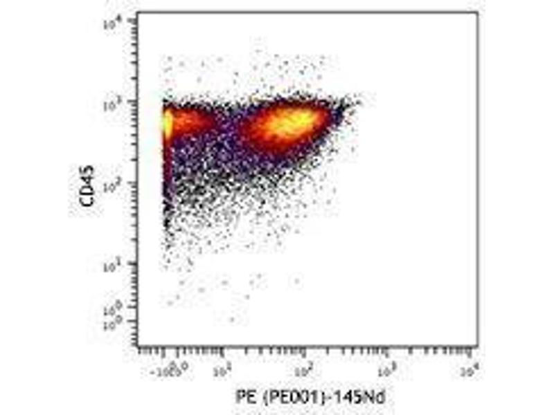The PE001 antibody reacts with both phycoerythrin (PE) alone and PE conjugated with antibody or streptavidin, as well as PE tandem dyes such as PE/Cy5, PE/Cy5.5 and PE/Cy7. When PE001 antibody is used in a three-step staining procedure or separation of PE-antibody labeled cells, it does not quench PE fluorescence or react with tested mouse and human cells. The PE001 antibody can be used for separation of PE-antibody labeled cells or as a secondary step to amplify PE conjugated primary antibody signals (i.e. biotinylated PE001 as secondary step, followed by Streptavidin-PE).