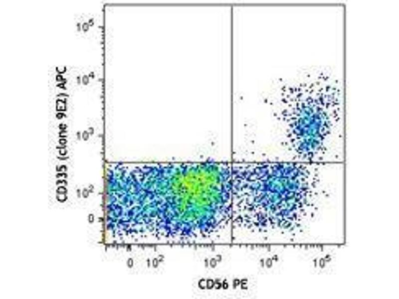 CD335, also known as NKp46, is a member of the natural cytotoxicity receptor (NCR) family which triggers cytotoxicity in NK cells. CD335 is direct-ly involved in target cell recognition and lysis, and is exclusively expressed on CD3-CD56+ NK cells, suggesting it is a universal marker for NK cells. NKp46, along with NKp30 and NKp44, is referred to as a natural cytoxicity receptor (NCR) and plays a very important role in killing virus-infected tumor cells and MHC-class I-unprotected cells.