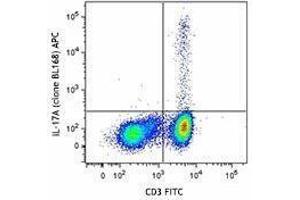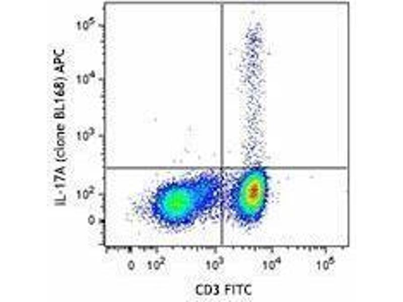 IL-17A is the founding member of the IL-17 family, a group of six structurally related pro-inflammatory cytokines. IL-17A, secreted by activated CD4+ Th17 cell subpopulation, elicits multiple biological activities on a variety of cells including: the induction of IL-6, IL-8, G-CSF, and PGE2 production in epithelial, endothelial or fibroblasts, the enhancement of surface expression of ICAM-1 in fibroblasts, activation of NF-κB and costimulation of T cell proliferation. Recent studies demonstrated that, in mice, activated IL-17-secreting CD4+ helper T cells (Th17 cells) mediate an autoimmune arthritis that clinically and immunologically resembles rheumatoid arthritis (RA). Human IL-17A shows 63 % , 63 %, and 72 % amino acid sequence identity to rat IL-17A, mouse IL-17A, and a protein encoded by the ORF13 gene of herpesvirus Saimiri (HVS), respectively.