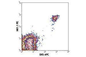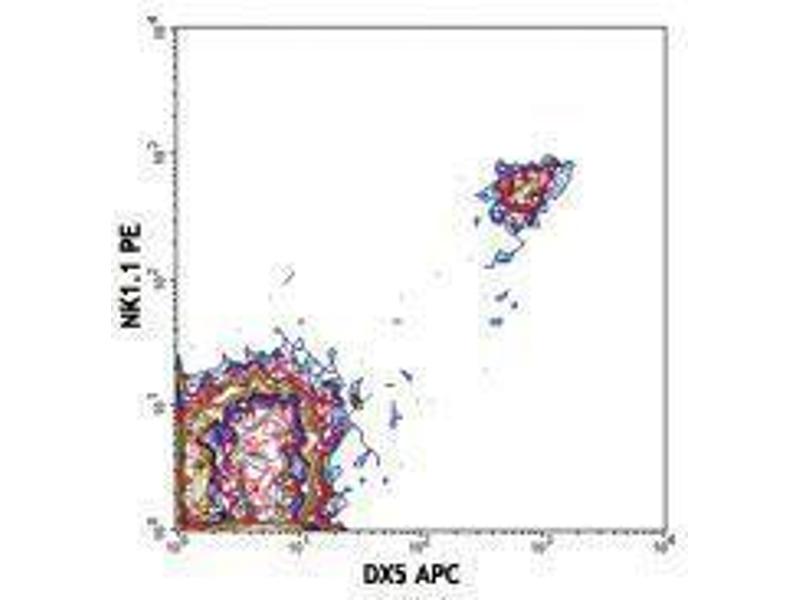 DX5 antigen has been recently characterized as CD49b. It is a 150 kD integrin α chain also known as α2 integrin, VLA-2 α chain, and integrin α2 chain. CD49b non-covalently associates with CD29 (β1 integrin) to form the CD49b/CD29 complex known as VLA-2, a receptor for collagen and laminin. CD49b is expressed on platelets, the majority of NK cells, NKT cells, and a small subset of CD8+ T cells (this population can be significantly increased following viral infection). DX5 is used for the identification and isolation of NK cells, and is especially useful for identifying NK cells in mice lacking the NK1.1 antigen.