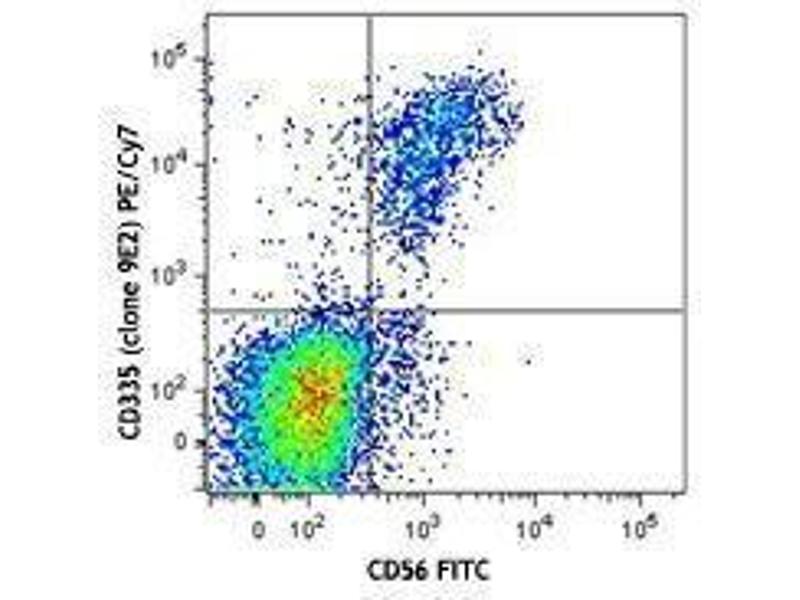 CD335, also known as NKp46, is a member of the natural cytotoxicity receptor (NCR) family which triggers cytotoxicity in NK cells. CD335 is direct-ly involved in target cell recognition and lysis, and is exclusively expressed on CD3-CD56+ NK cells, suggesting it is a universal marker for NK cells. NKp46, along with NKp30 and NKp44, is referred to as a natural cytoxicity receptor (NCR) and plays a very important role in killing virus-infected tumor cells and MHC-class I-unprotected cells.