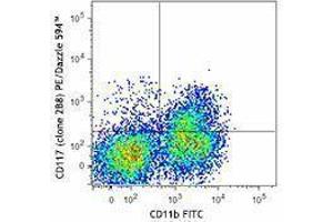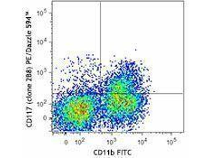 CD117 is a 145 kD immunoglobulin superfamily member also known as c-Kit and stem cell factor receptor (SCFR). It is a transmembrane tyrosine-kinase receptor that binds the c-Kit ligand (also known as steel factor, stem cell factor, and mast cell growth factor). CD117 is expressed on hematopoietic stem cells (including multipotent hematopoietic stem cells, progenitors committed to myeloid and/or erythroid lineages, and T and B cell precursors), mast cells, and acute myeloid leukemia (AML) cells. CD117 interaction with its ligand is critical for the development of hematopoietic stem cells.