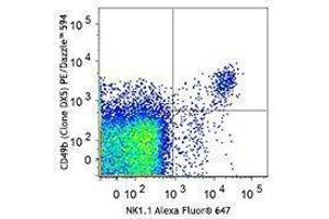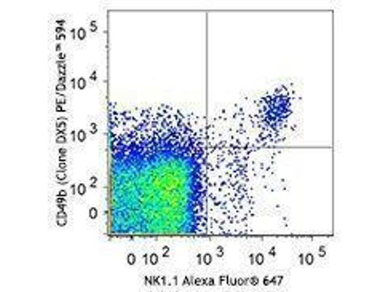 DX5 antigen has been recently characterized as CD49b. It is a 150 kD integrin α chain also known as α2 integrin, VLA-2 α chain, and integrin α2 chain. CD49b non-covalently associates with CD29 (β1 integrin) to form the CD49b/CD29 complex known as VLA-2, a receptor for collagen and laminin. CD49b is expressed on platelets, the majority of NK cells, NKT cells, and a small subset of CD8+ T cells (this population can be significantly increased following viral infection). DX5 is used for the identification and isolation of NK cells, and is especially useful for identifying NK cells in mice lacking the NK1.1 antigen.