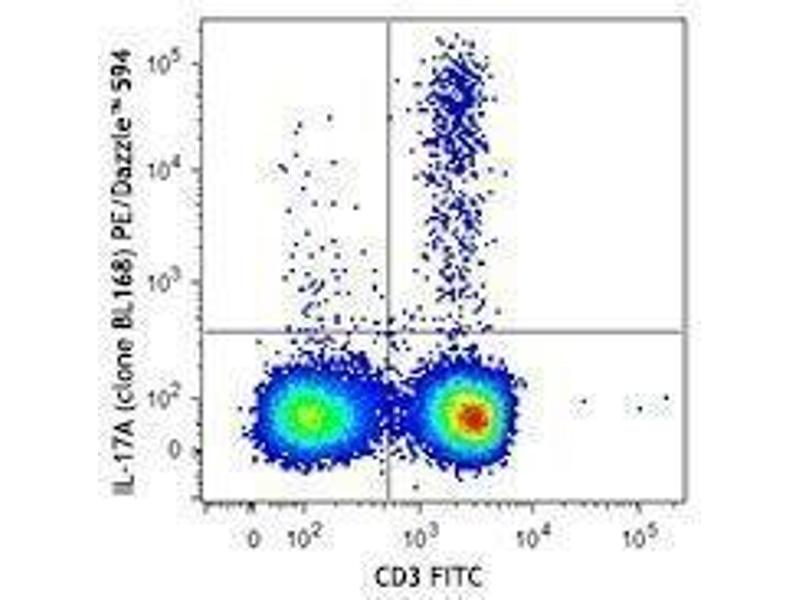 IL-17A is the founding member of the IL-17 family, a group of six structurally related pro-inflammatory cytokines. IL-17A, secreted by activated CD4+ Th17 cell subpopulation, elicits multiple biological activities on a variety of cells including: the induction of IL-6, IL-8, G-CSF, and PGE2 production in epithelial, endothelial or fibroblasts, the enhancement of surface expression of ICAM-1 in fibroblasts, activation of NF-κB and costimulation of T cell proliferation. Recent studies demonstrated that, in mice, activated IL-17-secreting CD4+ helper T cells (Th17 cells) mediate an autoimmune arthritis that clinically and immunologically resembles rheumatoid arthritis (RA). Human IL-17A shows 63 % , 63 %, and 72 % amino acid sequence identity to rat IL-17A, mouse IL-17A, and a protein encoded by the ORF13 gene of herpesvirus Saimiri (HVS), respectively.
