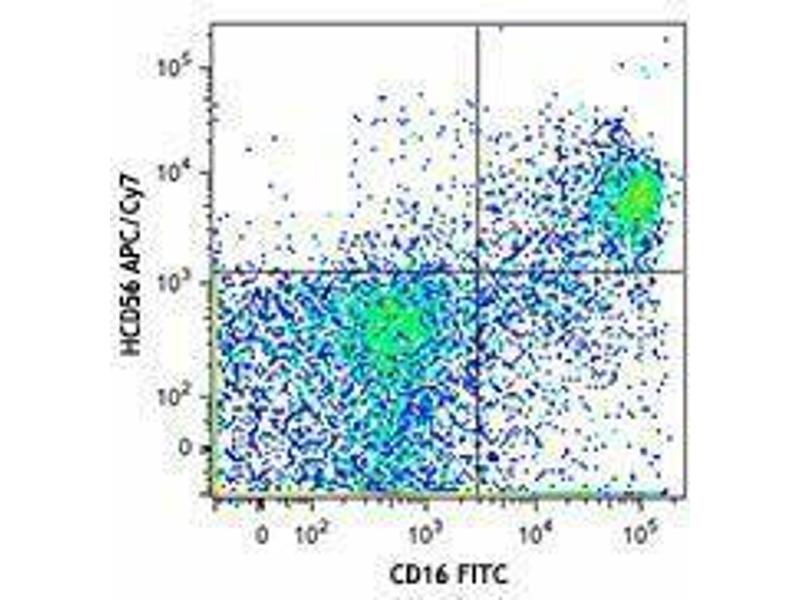 CD56 is a single transmembrane glycoprotein also known as NCAM (Neural Cell Adhesion Molecule), Leu-19, or NKH1. It is a member of the Ig superfamily. The 140 kD isoform is expressed on NK cells and NK-T cells. CD56 is also expressed in the brain (cerebellum and cortex) and at neuromuscular junctions. Certain large granular lymphocyte (LGL) leukemias, small-cell lung carcinomas, neuronal derived tumors, myelomas, and myeloid leukemias also express CD56. CD56 plays a role in homophilic and heterophilic adhesion via binding to itself or heparin sulfate.