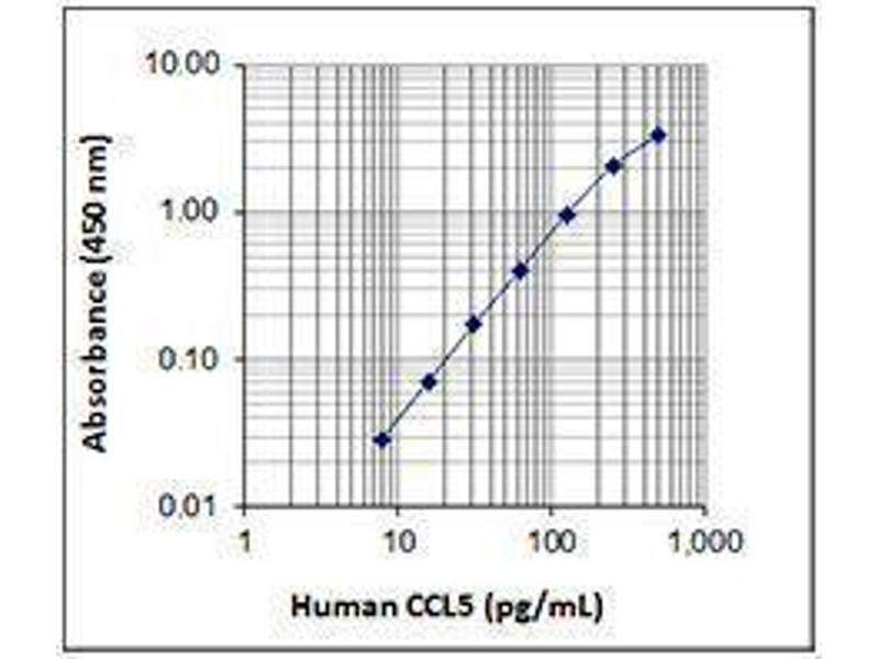 CCL5 (RANTES), also known as CCL5, is a 7.8 kD member of the CC family of chemokines, which is expressed in T cells and monocytes/macrophages. RANTES is strongly chemotactic for monocytes/macrophages, memory T cells, eosinophils, and induces histamine release from basophils. In a solution, RANTES can form high molecular weight aggregates that exhibit dissimilar biological activities to its dimeric form. The aggregates cause T cell and neutrophil activation while promoting HIV infection, whereas the dimeric form exhibits RANTES-induced chemotaxis and inhibits HIV infection. As T cells become activated, RANTES secretion appears to decrease.