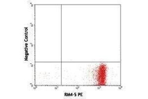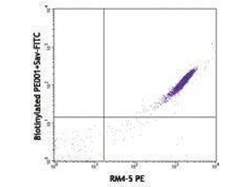 The PE001 antibody reacts with both phycoerythrin (PE) alone and PE conjugated with antibody or streptavidin, as well as PE tandem dyes such as PE/Cy5, PE/Cy5.5 and PE/Cy7. When PE001 antibody is used in a three-step staining procedure or separation of PE-antibody labeled cells, it does not quench PE fluorescence or react with tested mouse and human cells. The PE001 antibody can be used for separation of PE-antibody labeled cells or as a secondary step to amplify PE conjugated primary antibody signals (i.e. biotinylated PE001 as secondary step, followed by Streptavidin-PE).