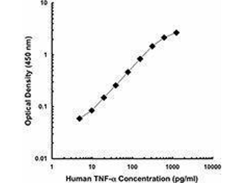 TNF-α is secreted by macrophages, monocytes, neutrophils, T cells (principally CD4+), and NK cells. Many transformed cell lines also secrete TNF-α. Monomeric human TNF-α is a 157 amino acid protein (non-glycosylated) with a reported molecular weight of 17 kD. TNF-α forms multimeric complexes, stable trimers are most common in solution. A 26 kD membrane form of TNF-α has also been described. TNF-α binding to surface receptors elicits a wide array of biological activities including: cytolysis and cytostasis of many tumor cell lines in vitro, hemorraghic necrosis of tumors in vivo, increased fibroblast proliferation, and enhanced chemotaxis and phagocytosis in neutrophils.