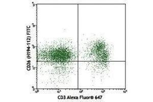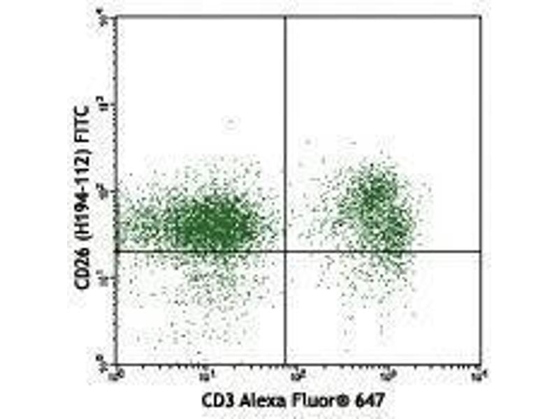CD26, also known as DPP IV or THAM, is a 220 kD type II transmembrane homodimer. It consists of an α/β hydrolase domain and an eight-blade beta-propeller domain. After proteolysis of the membrane-bound CD26, a soluble form of DPP IV is released. CD26 is expressed on thymocytes (development dependent), T cells, B cells, NK cells, and macrophages. It is involved in T cell costimulation, endothelial cell migration and proteolysis processes.