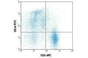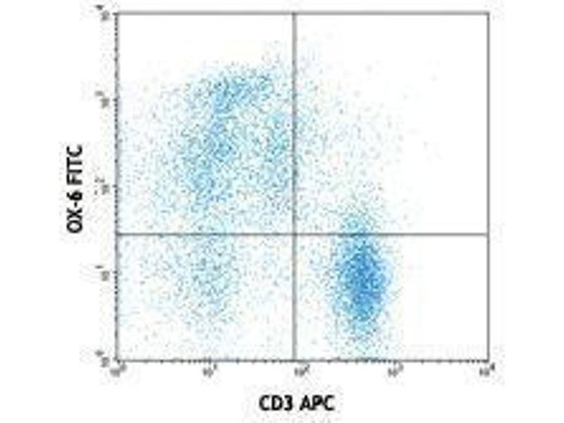 RT1B is expressed on peripheral B lymphocytes, epidermal Langerhans cells, dendritic cells, some tissue macrophages, subsets of thymocytes, peritoneal mast cells, and small intestinal villus epithelium. The OX-6 antibody reacts with non-polymorphic determinants of the rat MHC class II antigen, I-A equivalent. The OX-6 monoclonal antibody cross-reacts with mouse I-A[k] and I-A[s] alloantigens and with a major subset of splenocytes from NOD (I-A [g7]) mice.