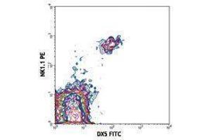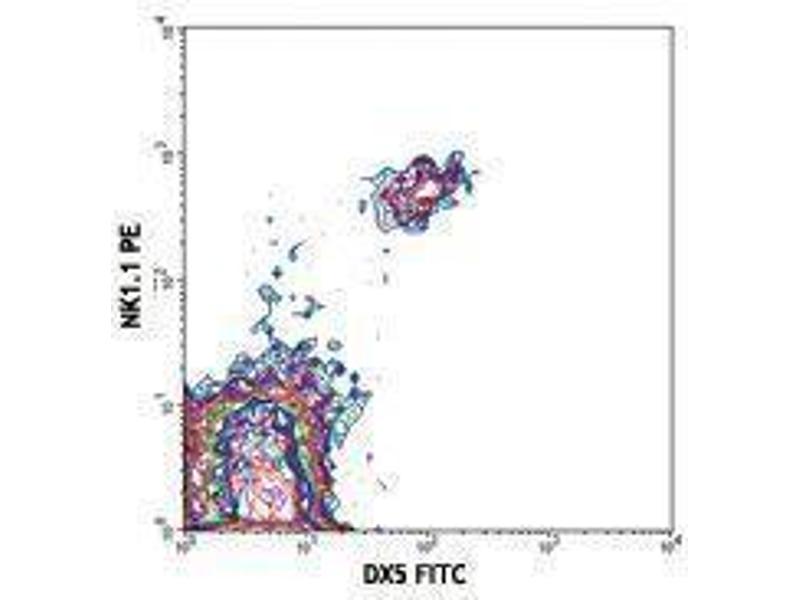DX5 antigen has been recently characterized as CD49b. It is a 150 kD integrin α chain also known as α2 integrin, VLA-2 α chain, and integrin α2 chain. CD49b non-covalently associates with CD29 (β1 integrin) to form the CD49b/CD29 complex known as VLA-2, a receptor for collagen and laminin. CD49b is expressed on platelets, the majority of NK cells, NKT cells, and a small subset of CD8+ T cells (this population can be significantly increased following viral infection). DX5 is used for the identification and isolation of NK cells, and is especially useful for identifying NK cells in mice lacking the NK1.1 antigen.