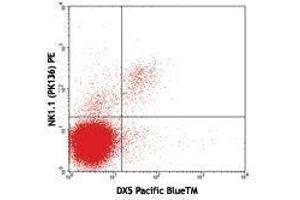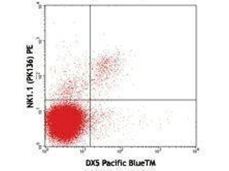 DX5 antigen has been recently characterized as CD49b. It is a 150 kD integrin α chain also known as α2 integrin, VLA-2 α chain, and integrin α2 chain. CD49b non-covalently associates with CD29 (β1 integrin) to form the CD49b/CD29 complex known as VLA-2, a receptor for collagen and laminin. CD49b is expressed on platelets, the majority of NK cells, NKT cells, and a small subset of CD8+ T cells (this population can be significantly increased following viral infection). DX5 is used for the identification and isolation of NK cells, and is especially useful for identifying NK cells in mice lacking the NK1.1 antigen.