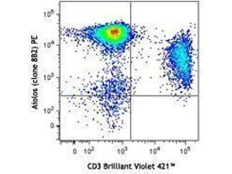 Aiolos, an Ikaros family member, is also known as Izkf3. It has a molecular weight of 58 kD and shows 70 % homology to the Ikaros isoform, Ik-1, particularly in the DNA binding and C-terminal domains. Aiolos can form a heteromer with Ikaros or exist as a homodimer. The homomeric complex is a potent transcriptional activator. Unlike Ikaros, Aiolos is expressed in late fetal thymus and adult lymphoid organs. Among the adult hematopoietic progenitors, Aiolos is expressed at low levels in mulitpotent but not in pluripotent stem cells. When these multipotent progenitors become more restricted to T and B lymphoid pathways there is an upregulation in Aiolos expression. The highest expression of Aiolos is detected in the spleen (especially in B-cells) followed by thymus and bone marrow, and cannot be detected in the non-lymphoid organs. Aiolos plays an important role in lymphocyte proliferation and differentiation.