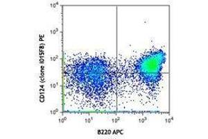 CD124, a subunit of IL-4R, is a 140 kD transmembrane glycoprotein. It associates with either the common γ-chain (CD132) to form the type I IL-4R complex, which specifically binds IL-4, or with IL-13Ra1 to form the type II IL-4R heterodimeric complex, which binds and transduces signals from either IL-4 or IL-13. A truncated form of IL-4Rα exists in soluble form in biological fluids. CD124 is expressed on mouse late precursors and mature B cells, T cells, monocytes, and has low expression on granulocytes. In B cells, CD124 can bind IL-4 and IL-13 and regulate IgE antibody production. In T cells, the type I IL-4R (IL-4R/gC) is mostly responsible for Th2 cell expansion by mediating IL-4-dependent activation of the transcription factors in hematopoietic cells. The type II IL-4R (IL-4R/IL-13Ra1) is the main route for nonhematopoietic cell responses to IL-4 or IL-13.