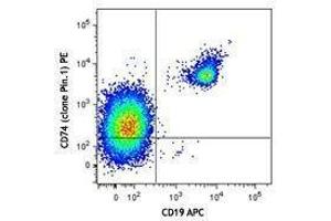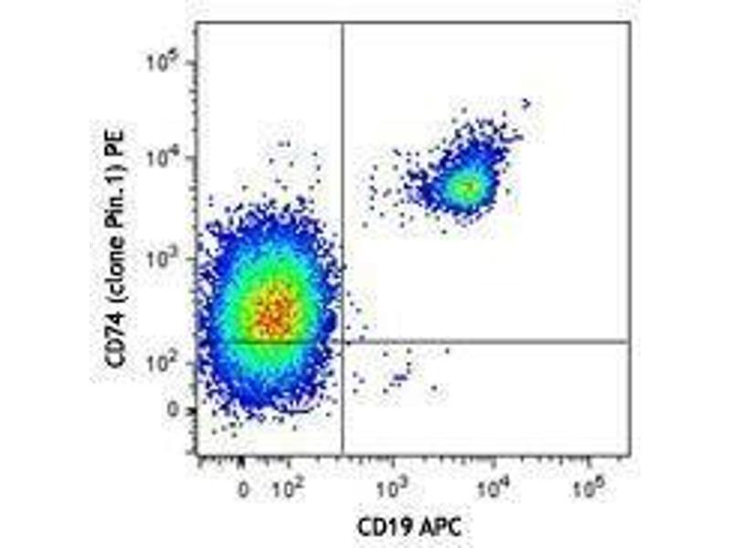 CD74 is a type II transmembrane glycoprotein also known as MHC class II associated invariant chain, invariant chain, Ii, MHC class II chaperone, and MIF receptor. CD74 exists in four isoforms with molecular masses of 33, 35, 41, and 43 kD, depending on genetic splicing. CD74 is primarily expressed on antigen presenting cells, including B cells, monocytes/macrophages, dendritic cells, and Langerhans cells. It is also expressed by activated T cells and activated endothelial and epithelial cells as well as carcinomas of lung, renal, gastric and thymic origin. The primary function of CD74 is intracellular sorting of MHC class II molecules and regulation of exogenous peptide loading onto MHC class II. It is also involved in the modulation of B cell differentiation and positive selection of CD4+ T cells. It has been reported that CD74 binds MIF (macrophage migration inhibitory factor) and signals through CD44 to regulate innate and adaptive immunity. It is also reported that H. pylori infection occurs through urease B binding of CD74 on gastric epithelial cells, inducing gastric epithelial cell apoptosis, NF-κB activation, and IL-8 production.