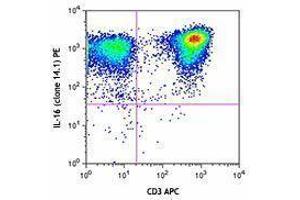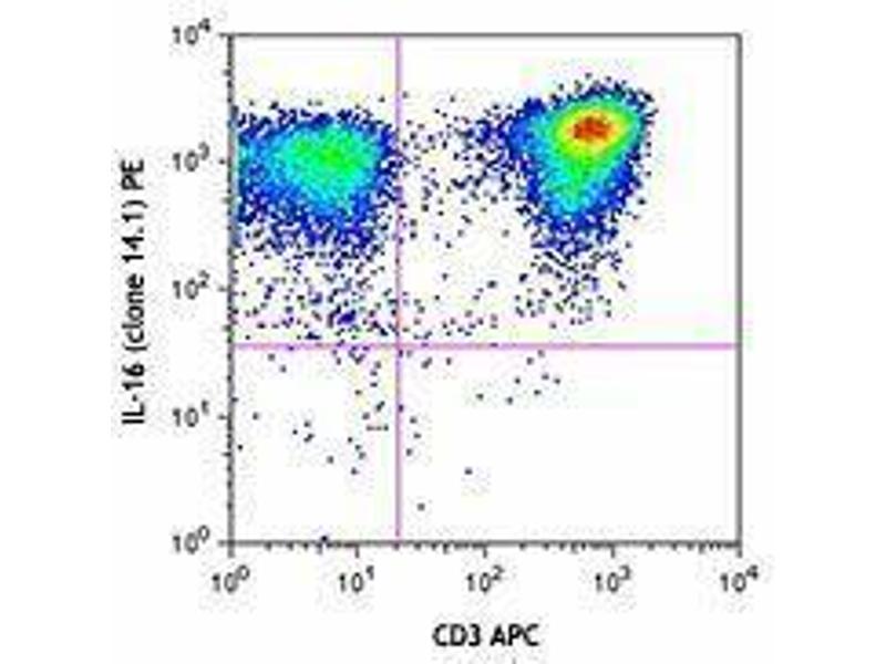 Interleukin-16 is a proinflammatory cytokine synthesized as a 68 kD precursor molecule (pro-IL-16). After cleavage of pro-IL-16 by caspase-3, IL-16 is released as a 12 kD protein, but its biologic activities are exerted by a tetramer. IL-16 is a chemoattractant for CD4+ T cells, monocytes, and eosinophils. On T cells, IL-16 upregulates CD25 and class II expression, and also inhibits HIV-1 replication in vitro by repressing the transcription of the HIV-1 long terminal repeat. IL-16 is expressed by lymphocytes, macrophages, eosinophils, mast cells, epithelial cells, and fibroblasts. CD4 and CD9 are the receptors of IL-16.