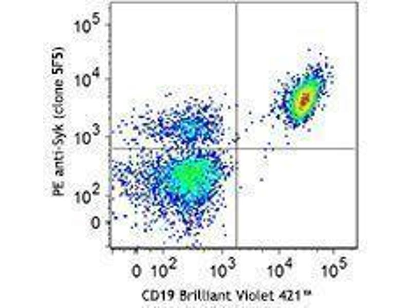 Syk is a cytoplasmic 72 kD non-receptor tyrosine kinase that is widely expressed in hematopoietic cells. The Syk kinase associates with a number of proteins including c-Src, Lck, Lyn, Fyn, Vav1, STAT3, SHP1, Grb2, and LAT to couple immunoreceptors to downstream signaling events mediating cellular proliferation, differentiation, and phagocytosis. Syk is modified by phosphorylation on multiple tyrosine sites.