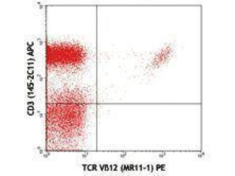 T cell receptor Vβ12 (TCR Vβ12) is a variant of TCR β chain and, along with TCR α chain, forms the TCR heterodimer. In association with the CD3 complex, TCR α/β is responsible for antigen recognition through interaction with MHC-peptide complex to initiate the T cell-mediated immune responses. The MR11-1 antibody reacts with the Vβ 12 TCR of mice bearing the b haplotype. It has been reported that Mtv-8 and Mtv-9 cause clonally deletion of Vβ12+ T cells.