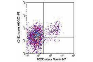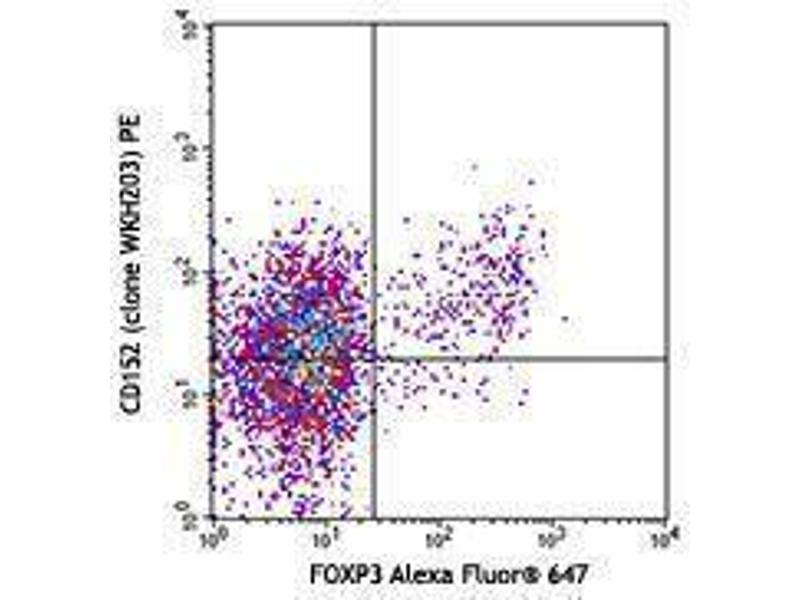 CD152 is a 33 kD member of the immunoglobulin superfamily also known as CTLA-4 or Ly-56. It is expressed on activated T and B lymphocytes. CD152 is similar to CD28 in amino acid sequence, structure, and genomic organization and these two receptors share common B7 family counter-receptors (B7-1, B7-2). Whereas CD28 delivers a costimulatory signal in T cell activation, CTLA-4 negatively regulates cell-mediated immune responses. CD152 is thought to play a role in the induction and maintenance of immunological tolerance, as well as the development of protective immunity and thymocyte regulation.