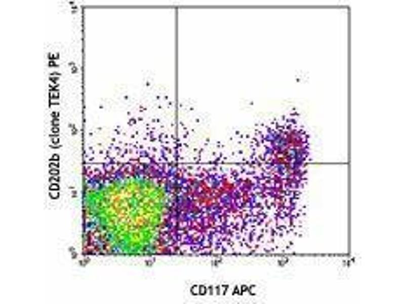 CD202b, also known as Tie-2 or TEK, is a 145 kD type I transmembrane protein. It is a member of the receptor tyrosine kinase (RTK) family of proteins and is expressed by endothelial cells and their progenitors, quiescent hematopoietic stem cells (HSCs), and a subpopulation of monocytes. Angiopoietin-1 (Ang-1) is an activator of CD202b to promote, maintain, and stabilize mature vessels and to maintain HSCs in the quiescent state. Ang-2 is another ligand of CD202b, which is involved in postnatal angiogenesis and in antagonizing the effects of Ang-1. Tie-2 also binds to Ang-4.