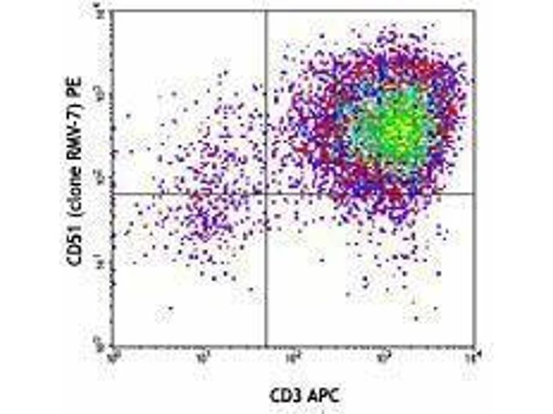 - CD51 is a 140 kD protein, also known as αV integrin, vitronectin receptor, and integrin αV. It is a member of the integrin family, expressed on activated T cells, polymorphonuclear granulocytes, platelets, blastocysts, and osteoclasts. CD51 forms heterodimers by association with integrins β 1, β3, β5 or β6, these complexes then act as receptors for multiple extracellular matrix proteins (ECM). The αv integrin heterodimers have varied functions in development, stimulation/activation and homeostasis. The primary ligands for CD51 complexes are fibronectin, fibrinogen, vitronectin, thrombspondin, von Willebrand factor, and CD31. The RMV-7 antibody has been reported to block binding of CD51 to vitronectin, fibronectin, and CD31 in some cell types, as well as blocking LAK cell cytotoxicity.