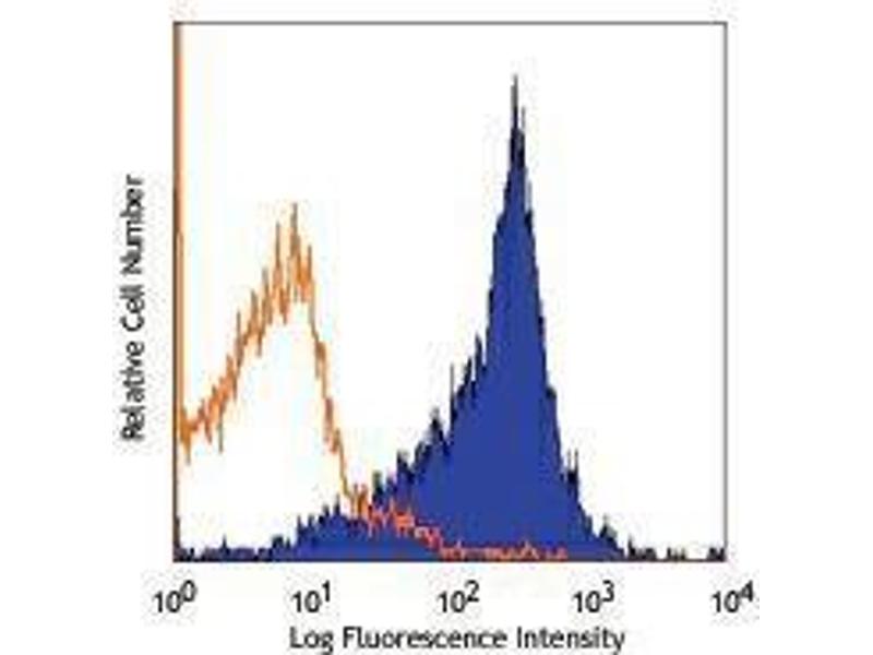 Integrin β7 is a 130 kD glycoprotein, also known as integin βp. It is a member of the Ig superfamily. In association with integrin α4 or αE chain, β7 forms α4/β7 or αE/β7 heterodimer. α4/β7 (CD49d/β7, LPAM-1) is expressed on majority of peripheral lymphocytes, small subsets of thymocytes and bone marrow progenitors. LPAM-1 binds to several ligands, VCAM-1, MAdCAM-1 and fibronectin, and is involved in lymphocyte adhesion, some hematopoietic progenitor cells migration. αE/β7 (CD103/β7,αIEL/β7) is expressed on intestinal intraepithelial lymphocytes (IEL), dendritic epidermal T cells, T regulatory cells, a subset of CD8+ T cells in lymph nodes and lamina propria. CD103/β7 complex is thought to play a role in lymphocyte retention via interaction with its lignd E-Cadherin. The FIB27 antibody has been reported to react with mouse and human β7 integrin and to block β7 integrin-mediated cell adhesion in in vitro and in vivo studies.