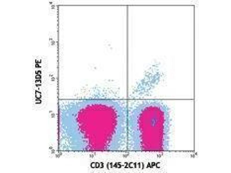 T cell receptor (TCR) is a heterodimer consisting of an α and a β chain (TCR α/β) or a γ and a δ chain (TCR γ/δ). TCR γ/δ belongs to the immunoglobulin superfamily, involved in the recognition of certain bacterial and tumor antigens bound to MHC class I. The TCR γ/δ associates with CD3 and is expressed on a T cell subset found in the thymus, the intestinal epithelium, and the peripheral lymphoid tissues and peritoneum. Most γ/δ T cells are CD4-/CD8-, some are CD8+. T cells expressing the TCR γ/δ have been shown to play a role in oral tolerance, tumor-associated tolerance, and autoimmune disease. It has been reported that γ/δ T cells also play a principal role in antigen presentation. Immobilized UC7-13D5 antibody has been reported to activate TCR-γ/δ-bearing T cells in vitro, and to deplete peripheral TCR-γ/δ-bearing T cells in vivo.