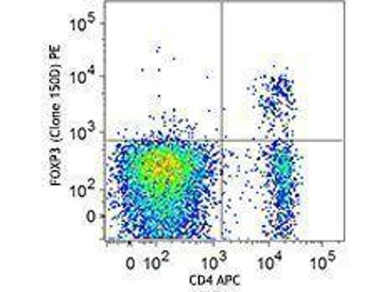 - FOXP3 is a 50-55 kD transcription factor, also known as Forkhead box protein P3, Scurfin, JM2, or IPEX. It is proposed to be a master regulatory gene and more specific marker of T regulatory cells than most cell surface markers (such as CD4 and CD25). Transduced expression of FOXP3 in CD4+/CD25- cells has been shown to induce GITR, CD103, and CTLA4 and impart a T regulatory cell phenotype. FOXP3 is mutated in X-linked autoimmunity-allergic dysregulation syndrome (XLAAD or IPEX) in humans and in "scurfy" mice. Overexpression of FOXP3 has been shown to lead to a hypoactive immune state suggesting that this transcriptional factor is a central regulator of T cell activity. In human, unlike in mouse, two isoforms of FOXP3 have been reported: one (FOXP3) corresponding to the canonical full-length sequence, the other (FOXP3 δ2) lacking exon 2. The 150D monoclonal antibody reacts with human, mouse and rat FOXP3. The 150D antibody recognizes FOXP3 epitope encoded by exon 2.