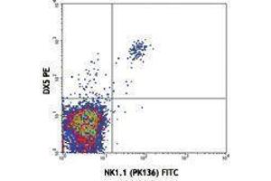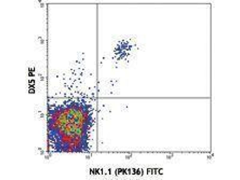 DX5 antigen has been recently characterized as CD49b. It is a 150 kD integrin α chain also known as α2 integrin, VLA-2 α chain, and integrin α2 chain. CD49b non-covalently associates with CD29 (β1 integrin) to form the CD49b/CD29 complex known as VLA-2, a receptor for collagen and laminin. CD49b is expressed on platelets, the majority of NK cells, NKT cells, and a small subset of CD8+ T cells (this population can be significantly increased following viral infection). DX5 is used for the identification and isolation of NK cells, and is especially useful for identifying NK cells in mice lacking the NK1.1 antigen.