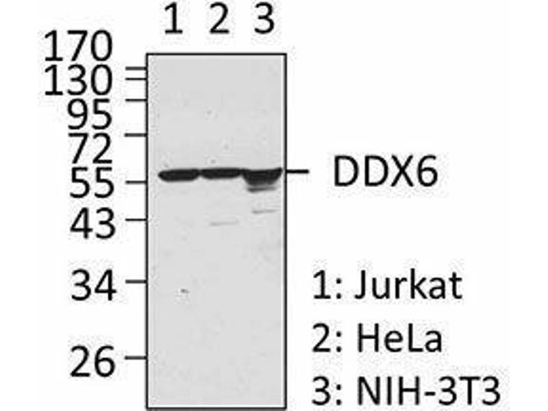 DDX6, also known as p54/RCK, is a member of the DEAD (Asp-Glu-Ala-Asp)-box RNA helicase family. DDX6 has been shown to localize to, and is required for the assembly of, processing bodies (P-bodies), which are cytoplasmic foci that consist of proteins involved in mRNA storage, processing, and turnover. DDX6 has ATP hydrolysis and RNA helicase activities, which are involved in secondary structure modulation and the degradation of mRNA. Interacting with key components of miRNA-induced silencing complexes, DDX6 participates in translational repression, as well. DDX6 is overexpressed in some colorectal tumor cells and can act as a proto-oncogene.