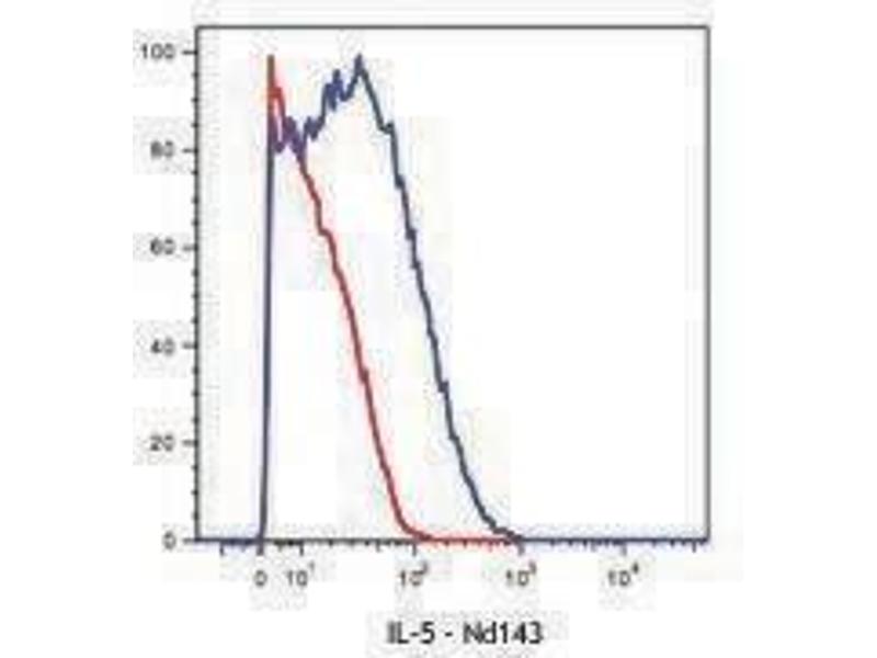 IL-5 is a homodimeric, disulphide-linked protein produced by T-cells. Monomeric human IL-5 is a 126 amino acid protein with a reported molecular weight of 26 kD for the homodimeric protein. Mouse and human IL-5 are approximately 70 % identical. IL-5 has been shown to promote the growth of immature hematopoietic BFU-E progenitors, stimulate the activation and differentiation of eosinophils, and promote the generation of cytotoxic lymphocytes. Mouse IL-5 induces the differentiation and proliferation of pre-activated B-cells and stimulates the production and secretion of IgM and IgA by B-cells stimulated with bacterial endotoxin. The TRFK5 antibody can neutralize the bioactivity of natural or recombinant IL-5.