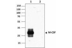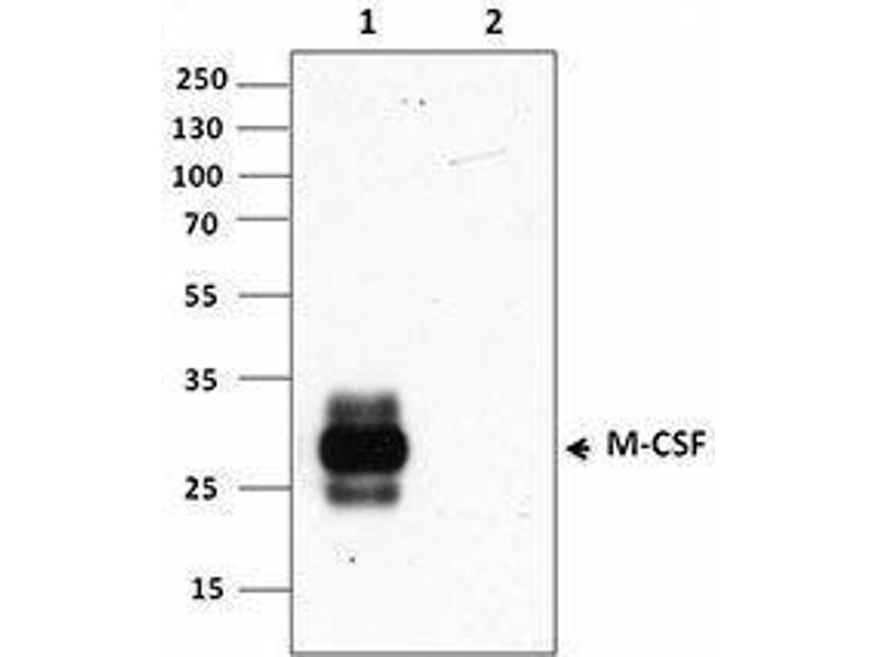 M-CSF is a cytokine that controls the production, differentiation, and function of macrophages. The active form of the protein is found extracellularly as a disulfide-linked homodimer. M-CSF is released by fibroblasts, breast cancer cell lines, alveolar macrophages, stromal bone marrow cells, endothelial cells, and mesenchymal cells. It binds CD14+ monocytes and promotes the survival/proliferation of human peripheral blood monocytes. In addition, M-CSF enhances inducible monocyte functions including phagocytic activity, microbial killing, cytotoxicity for tumor cells as well as synthesis of inflammatory cytokines such as IL-1, TNF-α, and IFN-γ in monocytes. M-CSF induces RANKL production in mature human osteoclasts and, consequently, this makes M-CSF a potent stimulator of mature osteoclast resorbing activity. Also, M-CSF induces VEGF production in human monocytes and human tumor cells. High levels of M-CSF, mononuclear phagocytes, and VEGF are associated with poor prognosis in patients with cancer.