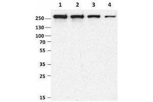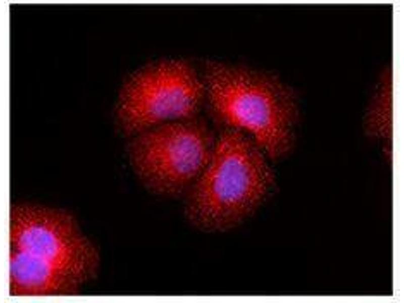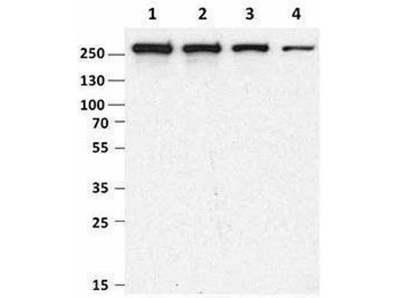 MTOR (mammalian target of rapamycin) is a 289 kD member of the PI3 kinase family, containing HEAT, FRB, and FATC domains. mTOR is expressed in the nucleus and cytoplasm, and is a target for cell-cycle arrest and the immunosuppressive effects of FKBP12-rapamycin complex. mTOR controls ribosome biogenesis and cell growth, and acts as an ATP sensor. mTOR is repressed by nutrient deprivation and mitochondrial uncoupling. mTOR is the target of PI3K-regulated protein kinase, AKT/PKB (phosphorylated at Thr 2446 and Ser2448). mTOR has also been shown to bind RAPTOR, which negatively regulates mTOR kinase activity, and is also inhibited by tuberin-hamartin tumor suppressor complex. The binding of RAPTOR to mTOR is necessary for the mTOR-catalyzed phosphorylation of 4EBP1 in vitro, and it strongly enhances the mTOR kinase activity toward p70-alpha.