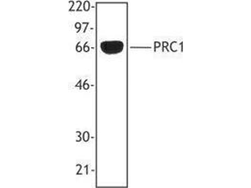 PRC1 (also known as protein regulator of cytokinesis 1 and mitotic spindle-associated CDK substrate) is a member of the MAP65/ASE1 family with a molecular weight of approximately 72 kD. PRC1 localization changes with cell-cycle position and can be found in the nucleus, the mitotic spindle, and the cell mid-body. PRC1 is a mitotic spindle-associated CDK substrate protein required for cytokinesis and maintenance of the spindle midzone. PRC1 can be modified by phosphorylation and has been shown to interact with Cdc2 and Cdk2. The 6G2 antibody recognizes the human PRC1 protein and has been shown to be useful for Western blotting.