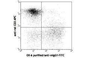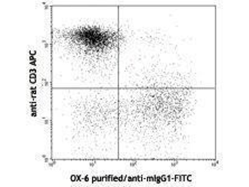RT1B is expressed on peripheral B lymphocytes, epidermal Langerhans cells, dendritic cells, some tissue macrophages, subsets of thymocytes, peritoneal mast cells, and small intestinal villus epithelium. The OX-6 antibody reacts with non-polymorphic determinants of the rat MHC class II antigen, I-A equivalent. The OX-6 monoclonal antibody cross-reacts with mouse I-A[k] and I-A[s] alloantigens and with a major subset of splenocytes from NOD (I-A [g7]) mice.