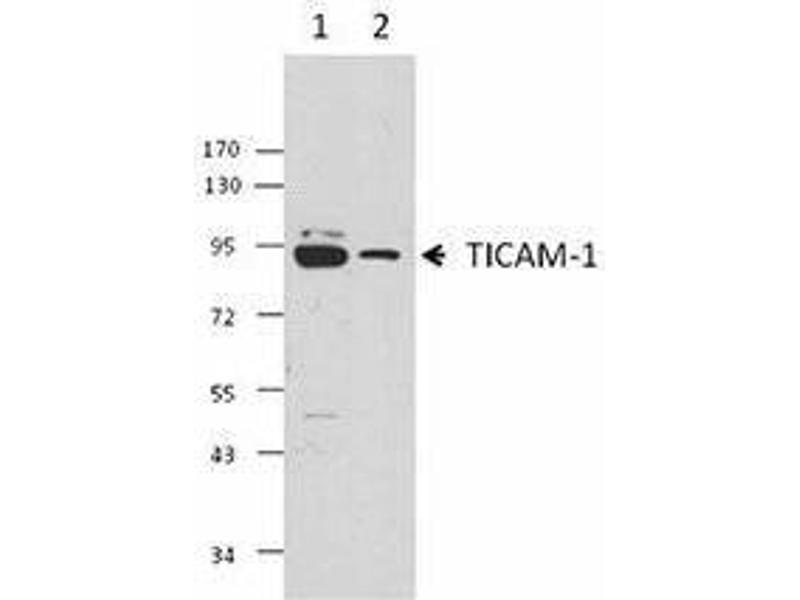 TICAM-1, also known as TRIF, is an intracellular adaptor protein utilized by TLR3 and TLR4. TLR3 recognizes double stranded viral RNA and induces TICAM-1 mediated type I interferon production. The N-terminal region of TICAM-1 recruits TBK1 and IKKi, which in turn phosphorylates the interferon regulatory transcription factor IRF3. The phosphorylated IRF3 is subsequently dimerized and translocates to the nucleus, resulting in transcriptional activation of the gene encoding IFN-β. Mice lacking in TICAM-1 expression are defective in the TLR3 mediated induction of proinflamatory cytokines, suggesting that TICAM-1 is crucial for TLR3 downstream signaling. TICAM-1 also mediates TLR4-induced signaling in the presence of the adaptor molecule TRAM. The C-terminal region of TICAM-1 recruits RIP1 and induces apoptosis through FADD/caspase cascade.