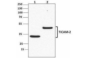 TICAM-2, also known as TRIF-related adaptor molecule (TRAM), is a TIR domain containing protein that was found to act as an adaptor molecule during LPS-induced innate immune response. Upon infection by Gram-negative bacteria, TLR4 specifically recognizes LPS and leads to the dimerization of the cytoplasmic TIR domains. The activated TLR4 subsequently recruits the adaptor protein complex containing both TICAM-1 and TICAM-2, resulting in the activation of IFN response factors and production of pro-inflammatory cytokines. In this signaling cascade, TICAM-2 is essential for bridging the interaction between TLR4 and TICAM-1. TICAM-2 is also involved in the regulation of the IL-18 signaling pathway, acting as a sorting adaptor that recruits MYD88 from the cytosol to the membrane region upon activation of IL-1/IL-18 receptors.