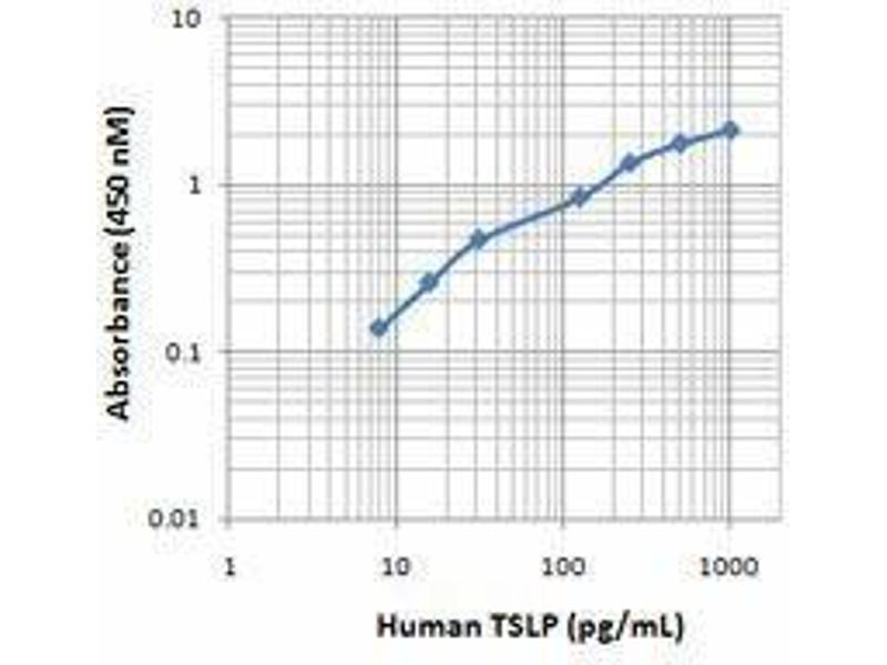 TSLP was initially identified in conditioned medium from a mouse thymic stromal cell line. Human and mouse TSLP are only 43 % identical at the amino acid level, and TSLP, like IL-7, exhibits species-specific functions and may function differently in humans and mice. TSLP binds to a heterodimeric receptor constituted by IL-7Ra and TSLPR. TSLPR has low affinity for TSLP, but in combination with IL-7Ra generates a high affinity binding site. TSLP has been associated with the development of allergic disorders in humans, such as asthma, atopic dermatitis, and food allergies. The susceptibility to allergic diseases has been associated to basophil induction by TSLP, and Th2 cytokine production induced by TSLP in mast cells. In addition, TSLP has been associated to the development of Tregs, and blocking TSLPR leads to delayed functional maturation of thymic Tregs. TSLPR has been detected in Tregs from allergic asthmatic patients. TSLP directly activates STAT5 in Tregs and suppresses its suppressive activities, additionally, it inhibits IL-10 production. Human TSLP induces the release of T cell-attracting chemokines (CCL17 and CCL22) from monocytes and enhances the T cell stimulatory capacity of the CD11c+ subset of dendritic cells. TSLP induces proliferation of naive T cells. In addition, it can drive Th2 differentiation via the induction of IL-4 production, and drives Th2 cytokine-mediated inflammation by acting on bone marrow-resident progenitors, which promotes basophil hematopoiesis. TSLP is upregulated in epithelial cells by IL-1α, TNFα, and Th2 cytokines.