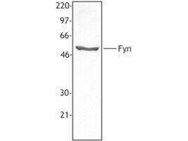 Fyn is a 59 kD protein tyrosine kinase and a member of the src subfamily. There are two reported isoforms of Fyn, FynT found in T cells, B cells and thymocytes, and FynB found in neuronal cells. Fyn has been shown to control cell growth, interact with the p85 subunit of PI3K, control high affinity IgE receptor-mediated mast cell degranulation, and participate in neuronal cell signaling. Fyn can be activated by T cell receptor engagement or anti-CD3 ligation. Fyn is known to be modified by phosphorylation and palmitoylation and has been shown to interact with Fyn binding protein, p85 PI3K, high affinity IgE receptor, and NCAM140. The FYN-59 monoclonal antibody recognizes human and mouse Fyn and has been shown to be useful for Western blotting, immunoprecipitation, and immunohistochemistry.