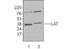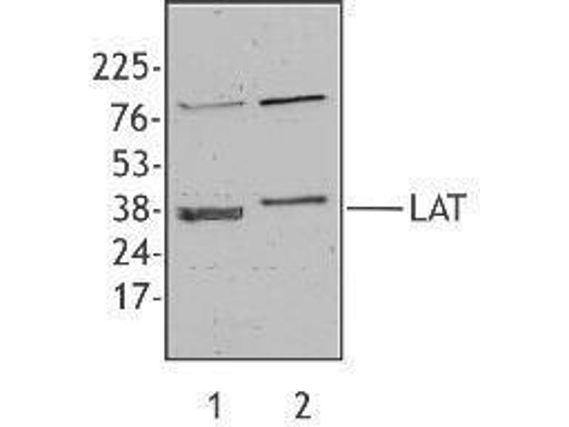 LAT is a transmembrane molecule that mediates signaling following the engagement of a number of cell surface receptors including TCR during mature T cell activation, pre-TCR during T cell development, Fc RIII on NK cells, and FcεRI on mast cells.LAT is multiply phosphorylated on tyrosines by ZAP-70 and Syk, which leads to downstream effects that include release of intracellular calcium, PKC activation, MAPK activation and cytoskeletal reorganization.Palmitoylation of LAT is required for its localization to lipid rafts and efficient phosphorylation.