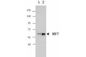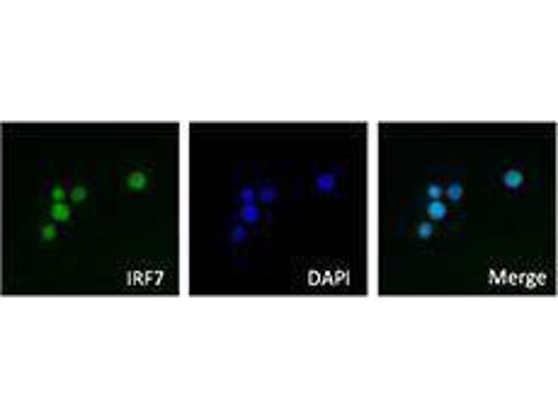 IRF-7 is a member of the interferon regulatory transcription factor family that plays key regulatory roles in innate immunity. Upon virus infection, IRF-7 forms a complex with MyD88 and TRAF6 when stimulated by toll-like receptors TLR7, TLR8, and TLR9, which in turn results in nuclear translocation and induction of interferon gene expression. IRF-7 gene expression is upregulated by the stimulation of interferon through the Jak-STAT signaling pathway, which forms a positive feedback loop. The protein level of IRF-7 after activation is then downregulated by the ubiquitin-proteasome system to avoid excessive production of interferons that may cause damage to the host. Virus induced type I interferon expression was completely abrogated in IRF-7 knockout mice, suggesting that IRF-7 is critical for interferon mediated host defense during virus infection.