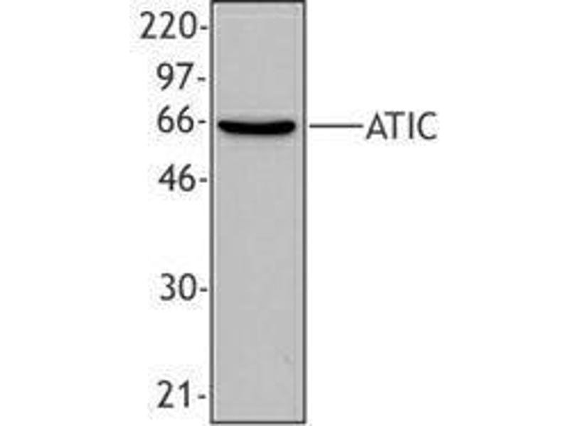 ATIC (AICAR transformylase/IMP cyclohydrolase) belongs to the purH family, expressed in the cytoplasm, predicted molecular weight approximately 65 kD. ATIC catalyzes the penultimate and final steps in the de novo purine nucleotide biosynthesis pathway. ATIC acts as a bifunctional enzyme catalyze the formation of FAICAR and IMP. AICA-ribosiduria is a recently discovered inherited metabolic disease caused by a defect in final steps of purine de novo biosynthesis. Clone F38P7H9 has been shown to be useful for western blotting and immunohistochemistry of human, mouse, rat, frog and fruit fly ATIC.