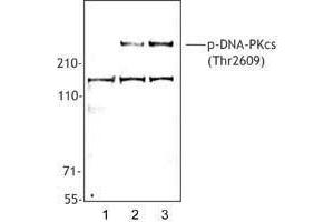 DNA-protein kinase catalytic subunit (DNA-PKcs) also known as DNA-activated kinase is a nuclear 460-470 kD serine threonine kinase involved in double-stranded DNA break repair, VDJ recombination, and transcriptional modulation. DNA-PKcs must bind DNA ends to become active. DNA-PKcs is modified by phosphorylation and has been shown to interact with Ku70/Ku80, KIP, DNA-ligase IV, and XRCC4 proteins. Phosphorylated DNA-PKcs is upregulated after DNA damaage. The 10B1 monoclonal antibody recognizes phosphorylated human DNA-PKcs (Thr2609) and has been shown to be useful for immunofluorescence staining and Western blotting.