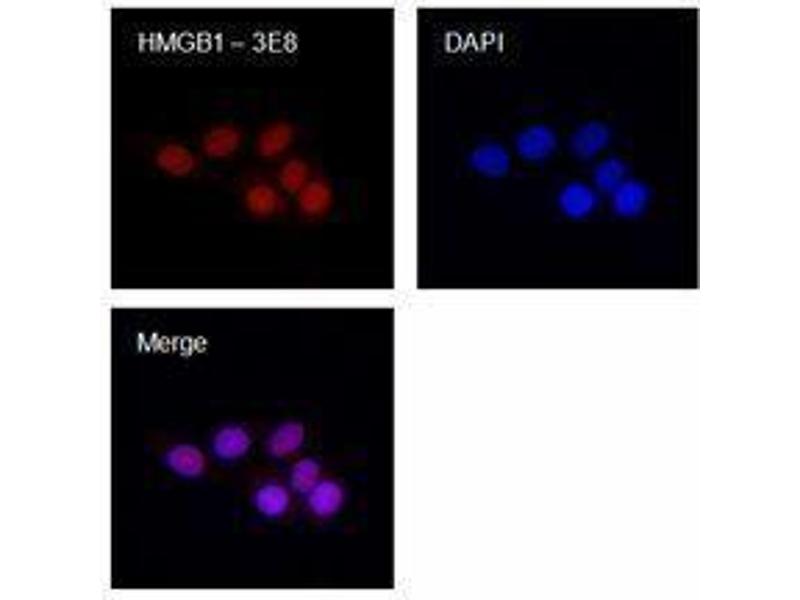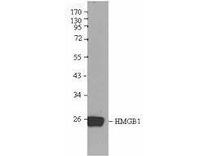 High mobility group protein B1 (HMGB1) belongs to a family of highly conserved proteins that contain HMG box domains. Human HMGB1 is expressed as a 215 amino acid (aa) single chain polypeptide containing three domains: two N-terminal globular, 70 aa positively charged DNA binding domains (HMG boxes A and B), and a negatively charged 30 aa C-terminal region that contains only Asp and Glu. Human HMGB1 is 100 % aa identical to canine HMGB1 and 99 % aa identical to mouse, rat, bovine and porcine HMGB1. HMGB1 is a widely expressed and highly abundant protein. It was originally discovered as a nuclear protein that could bend DNA. Such bending stabilizes nucleosome formation and regulates the expression of select genes upon recruitment by DNA binding proteins. It is now known that HMGB1 also plays a significant role in extracellular signaling associated with inflammation. HMGB1 is massively released into the extracellular environment during cell necrosis. It acts as an inflammatory mediator that promotes monocyte migration and cytokine secretion, and as a mediator of T cell-dendritic cell interaction. In addition, activated monocytes, macrophages, and dendritic cells also secrete HMGB1, forming a positive feedback loop that results in the release of additional cytokines and neutrophils. The cytokine activity of HMGB1 is restricted to the HMG B box, while the A box is associated with the helix-loop-helix domain of transcription factors. Although HMGB1 does not possess a classic signal sequence, it appears to be secreted as an acetylated form via secretory endolysosome exocytosis. Once secreted, HMGB1 transduces cellular signals through its high affinity receptor, RAGE and, possibly, TLR2 and TLR4.