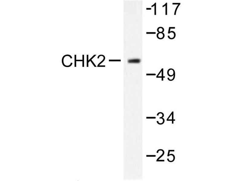 Cell cycle events are regulated by the sequential activation and deactivation of cyclin dependent kinases (Cdks) and by proteolysis of cyclins. Chk1 and Chk2 are involved in these processes as regulators of Cdks. Chk1 and Chk2 both function as essential components in the G2 DNA damage checkpoint by phosphorylating Cdc25C in response to DNA damage. Phosphorylation inhibits Cdc25C activity, thereby blocking mitosis. Cdc25A, Cdc25B and Cdc25C protein tyrosine phosphatases function as mitotic activators by dephosphorylating Cdc2 p34 on regulatory tyrosine residues. It has also been shown that Chk1 can phosphorylate Wee 1 in vitro, providing evidence that the hyperphosphorylated form of Wee 1, seen in cells delayed by Chk1 overexpression, is due to phosphorylation by Chk1.Synonyms: CHEK-2, CHEK2, CHK-2, CHK2 checkpoint homolog, Cds1, RAD53, Serine/threonine-protein kinase Chk2