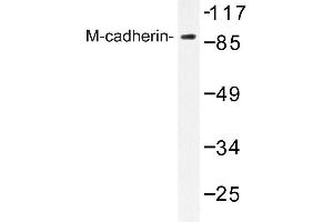 Cadherins are a multigene family of Ca++-dependent cell adhesion molecules. They are transmembrane glycoproteins consisting of an extracellular domain, which mediates Ca++-dependent intercellular adhesion by homophilic interactions, a transmembrane region and a cytoplasmic domain. The extracellular domain is divided into a series of subdomains designated EC1-EC5. Homolgies between different members of the cadherin family are most prominent in the cytoplasmic domain and in EC1 and EC2 and much less so in EC5 of the extracellular domain and in the transmembrane region. The binding properties and specificities of the adhesive function are located in the N-terminal part of the molecules. Four members of the cadherin family have been identified and molecularly cloned from mammalian cells. These include the neuronal (N), epithelial (E), placental (P) and muscle (M) cadherins. M-cadherin is not found in fibroblasts but is expressed at low level in myoblasts and is upregulated following induction of myotube formation, suggesting a specific function in skeletal muscle cell differentiation.Synonyms: CDH14, CDH15, CDH3, Cadherin M, Cadherin-14, M-Cadherin, Muscle cadherin