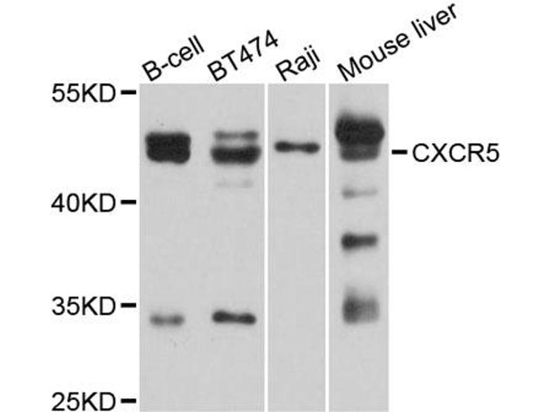 This Rabbit Polyclonal antibody specifically detects CXCR5 in WB, FACS and ICC. It exhibits reactivity toward Human, Mouse and Rat.