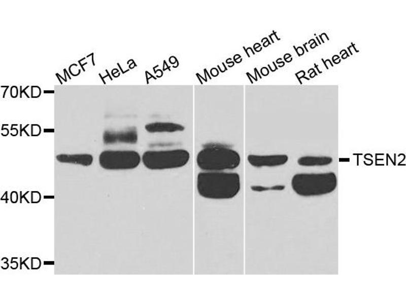 The Rabbit Polyclonal anti-TSEN2 antibody has been validated for WB, IHC and IF. It is suitable to detect TSEN2 in samples from Human.