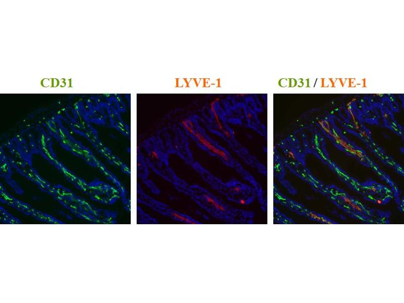 LYVE-1 has been identified as a major receptor for HA (extracellular matrix glycosaminoglycan hyaluronan) on the lymph vessel wall. Like CD44, the LYVE-1 Molecule binds both soluble and immobilized HA. However, unlike CD44, the LYVE-1 Molecule co-localizes with HA on the luminal face of the lymph vessel wall and is completely absent from blood vessels. Hence, LYVE-1 is the first lymph-specific HA receptor to be characterized and is a uniquely powerful marker for lymph vessels themselves.