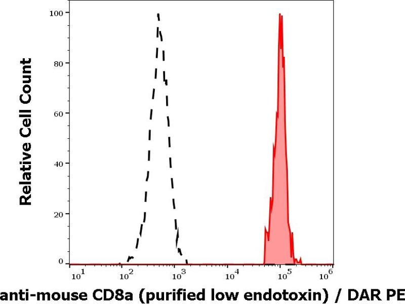 Functional application: Isolation and depletion of CD8+ cells, blocking of cytotoxicity, inhibition of CD8+ T cell proliferation. Flow cytometry: Recommended dilution: 1.5 μg/mL. Immunohistochemistry (frozen sections): Recommended dilution: 1:1000, formaldehyde fixation is not recommended, acetone fixation is preferred.